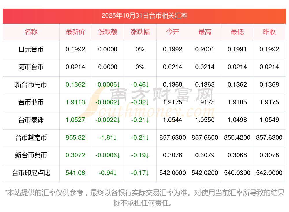 根據(jù)2025年10月31日匯率計算,臺幣兌換秘魯新索爾匯率最新價0.110137,今開價0.1102,昨收價0.1102,最高價0.1102,最低價0.1100。