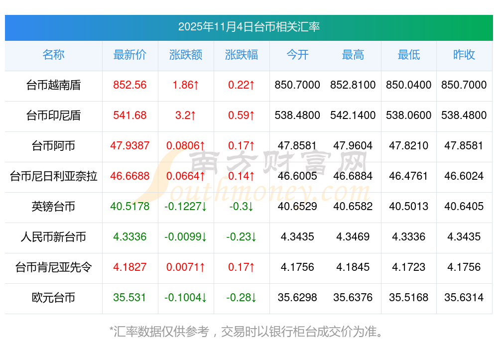 2025年11月4日臺(tái)幣相關(guān)匯率查詢