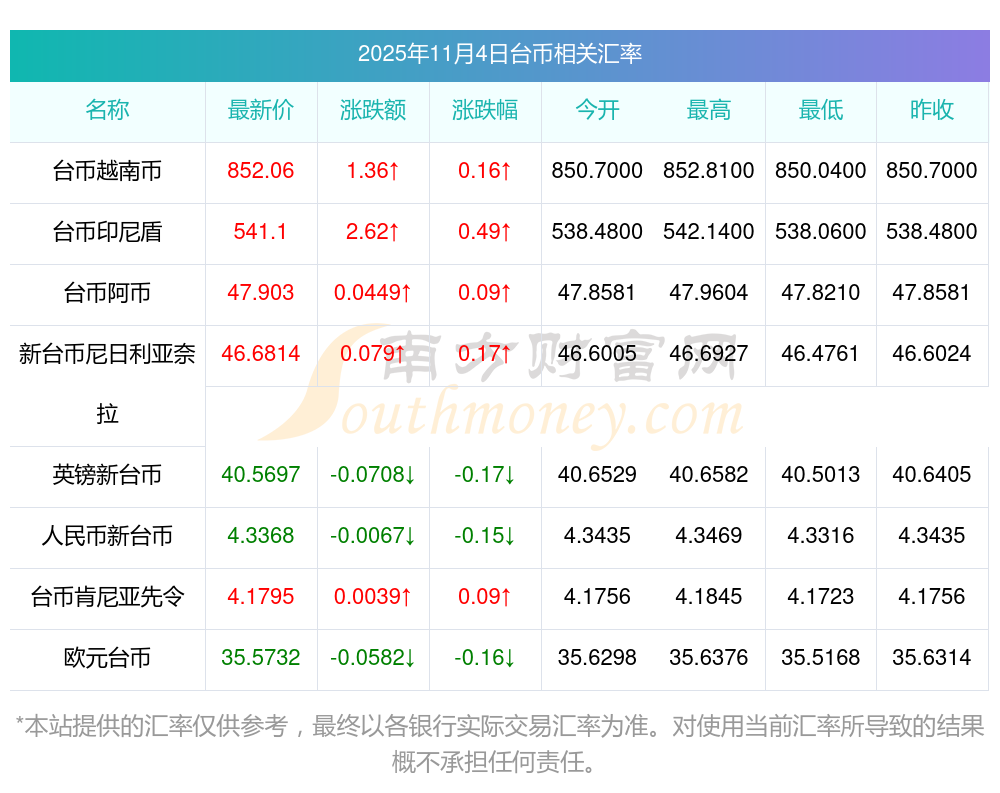 2025年11月4日臺幣相關匯率查詢