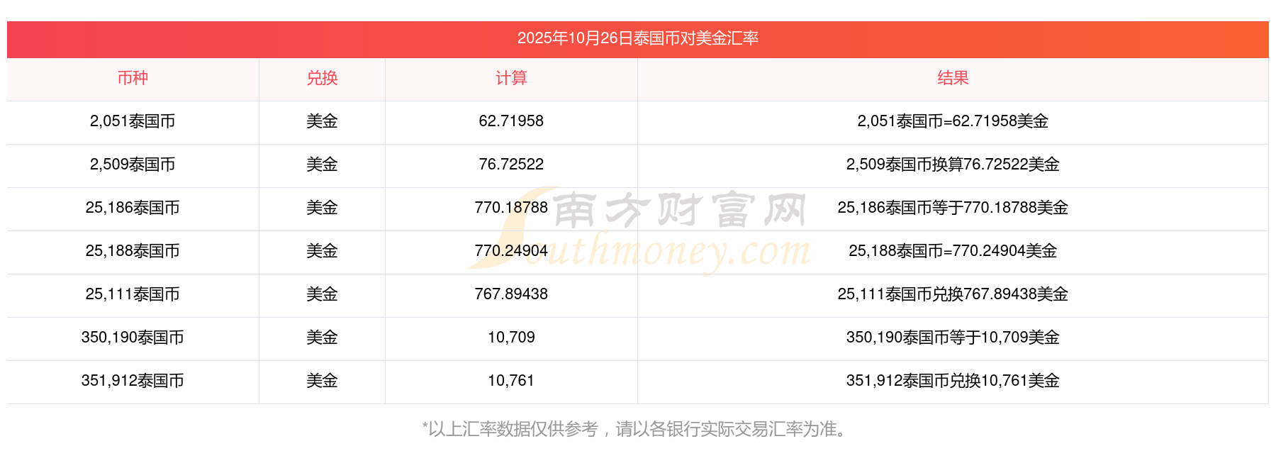 南方財(cái)富網(wǎng)為您提供泰國(guó)幣對(duì)美金匯率最新價(jià)格詳情。