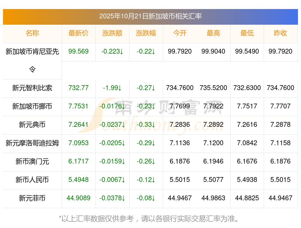 2025年10月21日新加坡幣相關(guān)匯率查詢