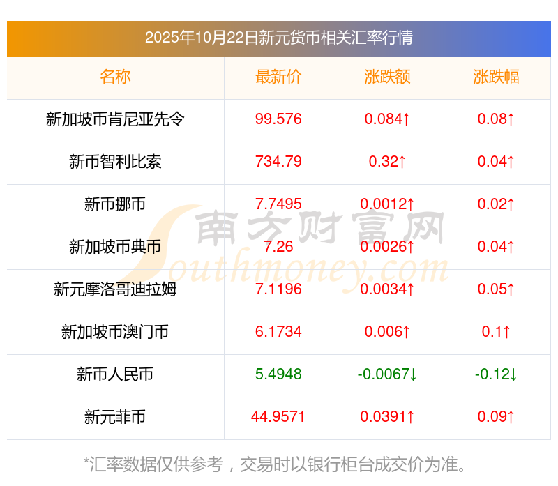 根據(jù)2025年10月22日匯率,新元兌換菲幣匯率最新價(jià)44.957100,今開價(jià)44.9163,昨收價(jià)44.9180,最高價(jià)44.9721,最低價(jià)44.8454。