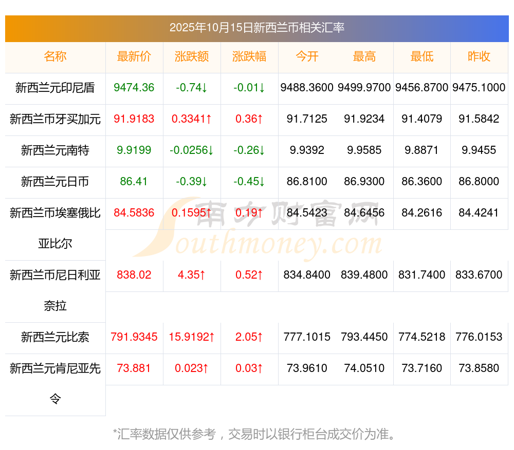 2025年10月15日新西蘭幣相關(guān)匯率查詢