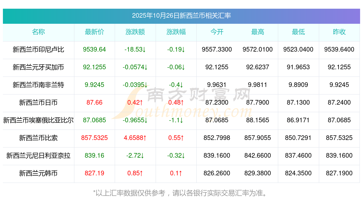 2025年10月26日新西蘭幣相關(guān)匯率查詢