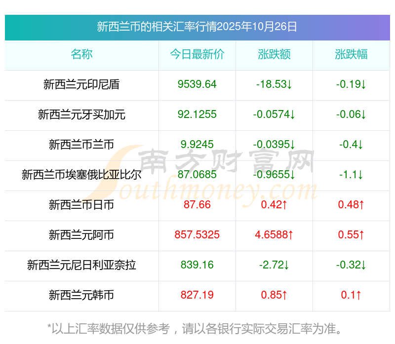 2025年10月26日新西蘭幣相關(guān)匯率查詢