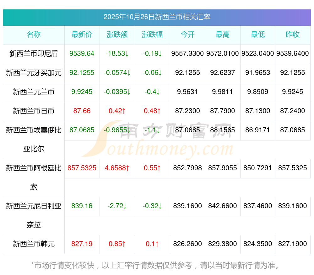 2025年10月26日新西蘭幣相關(guān)匯率查詢