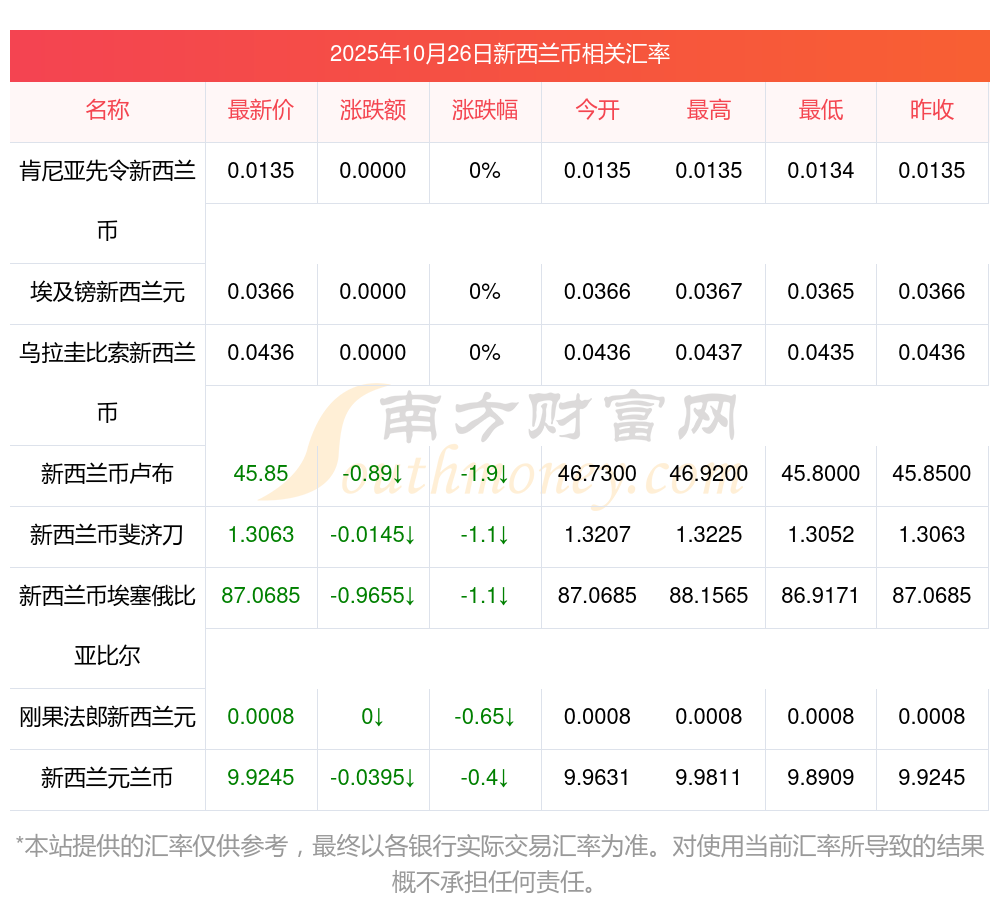 2025年10月26日新西蘭幣相關(guān)匯率查詢