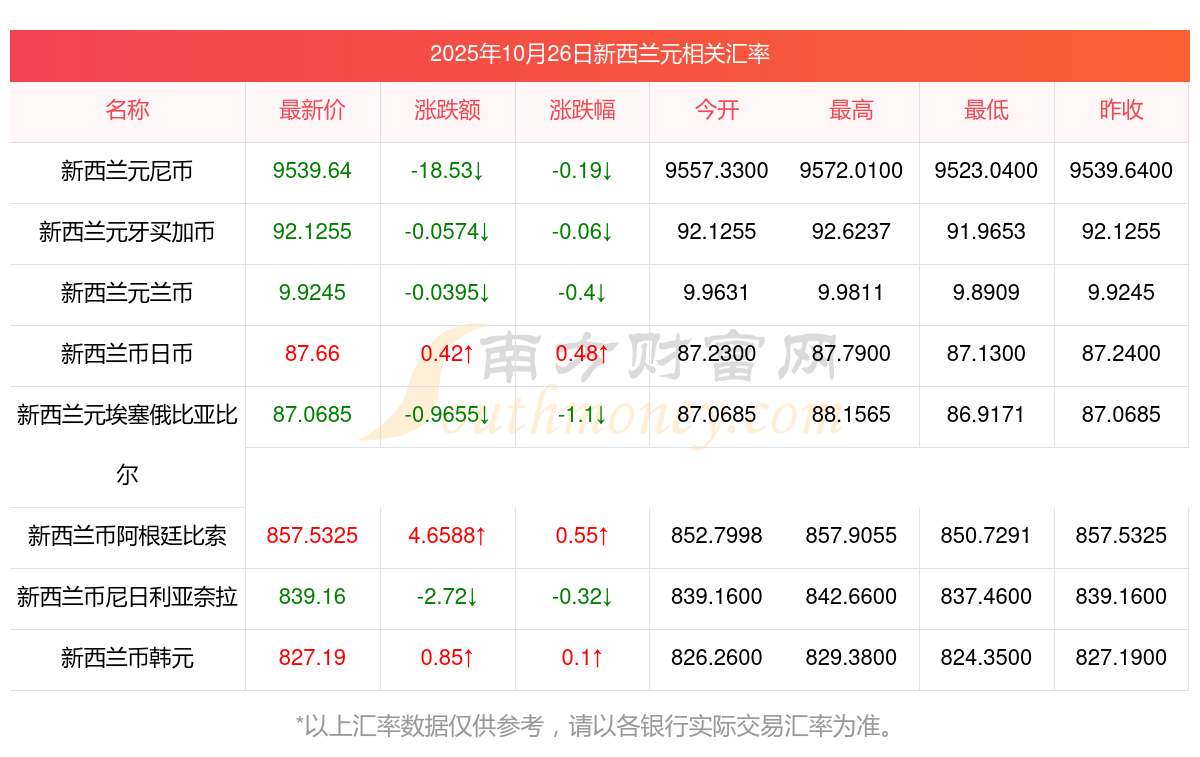 2025年10月26日新西蘭元相關(guān)匯率查詢