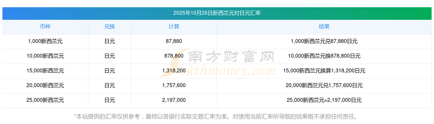 10新西蘭元對日元今天匯率是多少?2025/10/26
