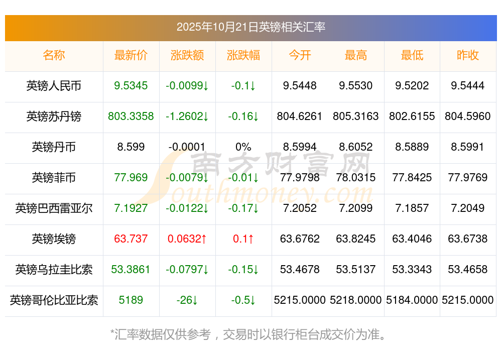 根據(jù)2025年10月21日匯率,英鎊兌換澳門元匯率最新價(jià)10.713400,今開價(jià)10.7351,昨收價(jià)10.7347,最高價(jià)10.7444,最低價(jià)10.7008。