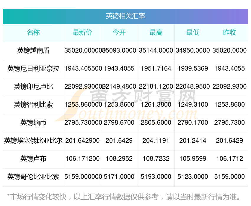 根據(jù)2025年10月26日匯率,英鎊兌換挪朗匯率最新價13.327500,今開價13.2950,昨收價13.3275,最高價13.3483,最低價13.2562。