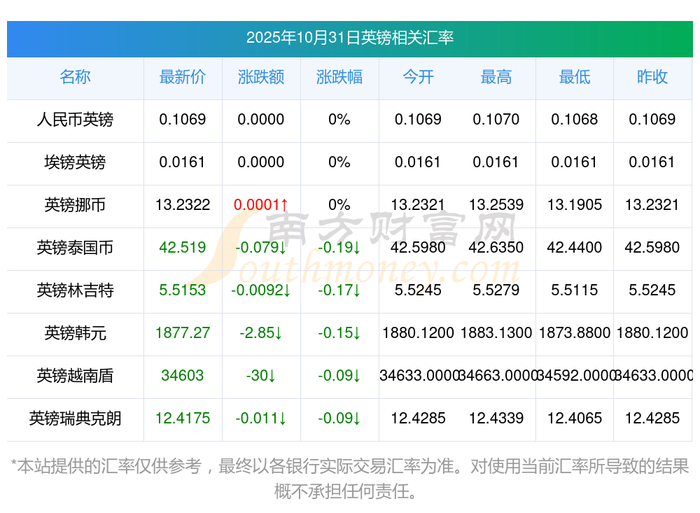根據(jù)2025年10月31日匯率,英鎊兌換哥倫比亞比索匯率最新價5073.000000,今開價5071.0000,昨收價5071.0000,最高價5085.0000,最低價5071.0000。