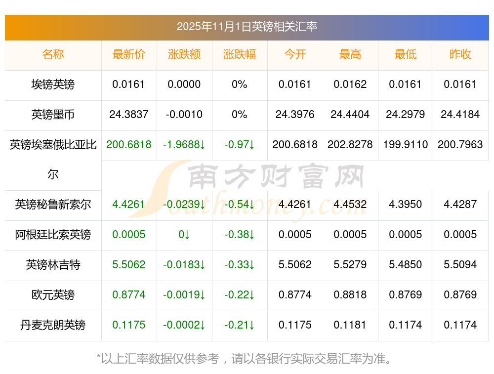 根據(jù)2025年11月1日匯率,英鎊兌換墨幣匯率最新價(jià)24.383700,今開價(jià)24.3976,昨收價(jià)24.4184,最高價(jià)24.4404,最低價(jià)24.2979。