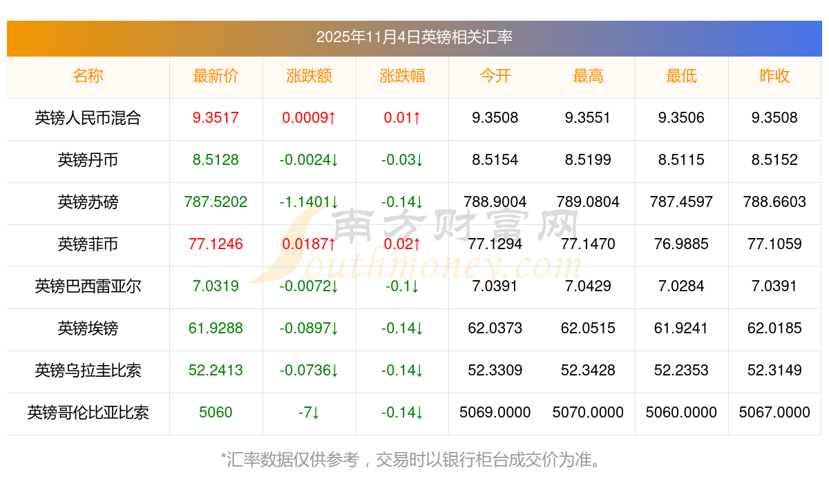 2025年11月4日英鎊相關(guān)匯率查詢