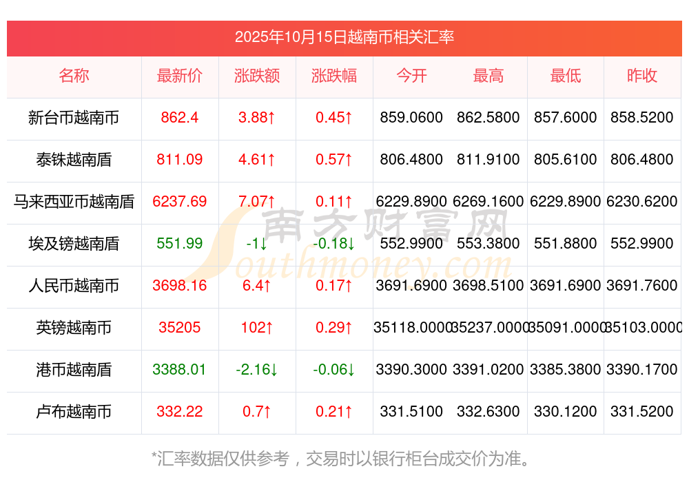 2025年10月15日越南幣相關匯率查詢