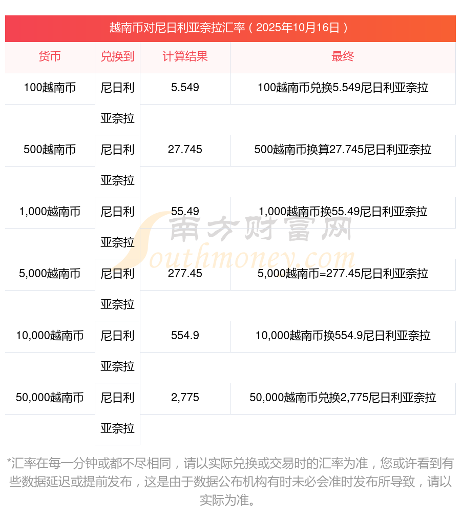 越南幣兌尼日利亞奈拉匯率查詢2025年10月16日