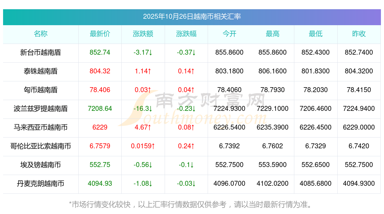 2025年10月26日越南幣相關(guān)匯率查詢