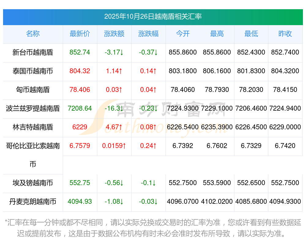 根據(jù)2025年10月26日匯率,越南盾兌換日元匯率最新價(jià)0.005812,今開價(jià)0.0058,昨收價(jià)0.0058,最高價(jià)0.0058,最低價(jià)0.0058。
