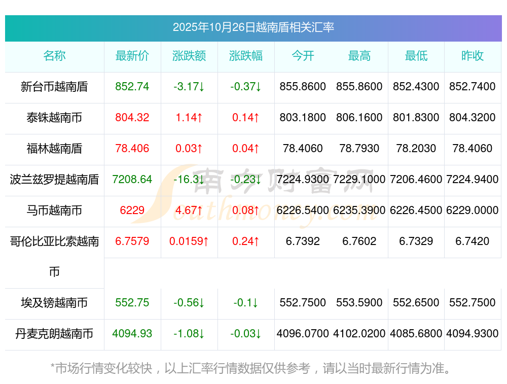 根據(jù)2025年10月26日匯率計算,越南盾兌換剛幣匯率最新價0.087250,今開價0.0872,昨收價0.0872,最高價0.0873,最低價0.0817。