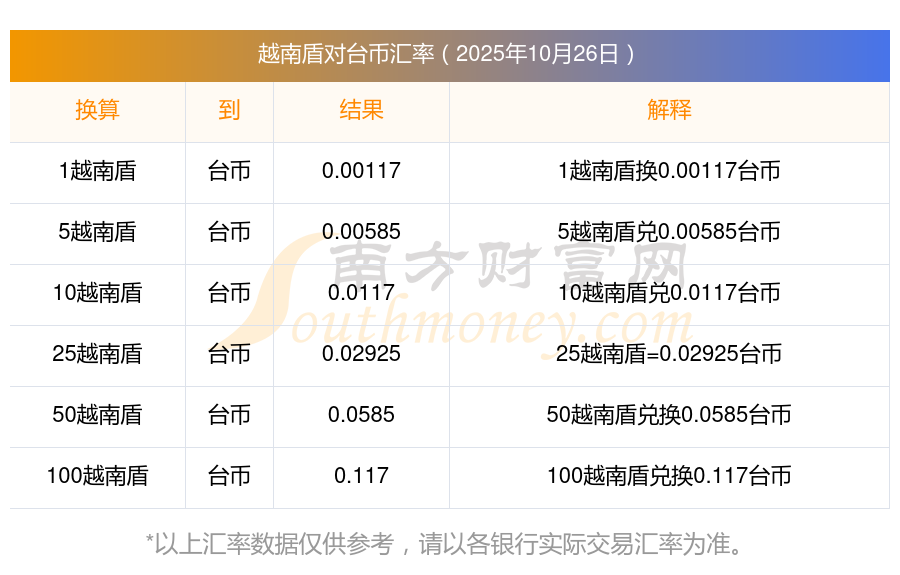 今天匯率越南盾兌換臺幣匯率計算表 10-26