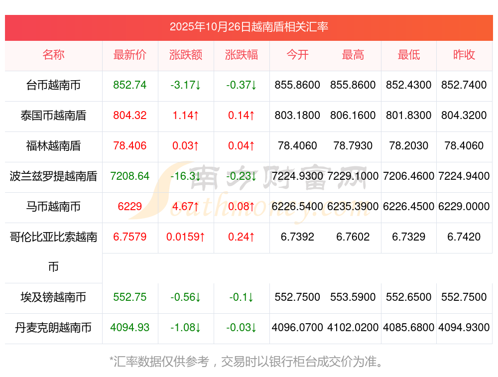 南方財富網(wǎng)為您提供越南盾對臺幣匯率最新價格詳情。