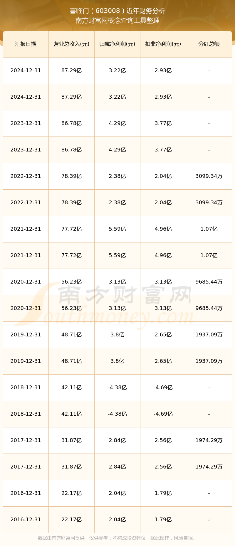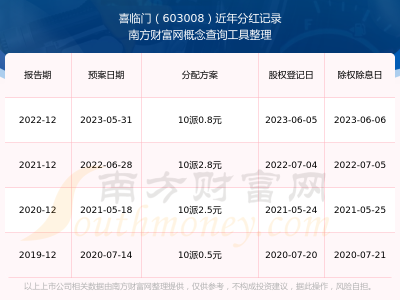 喜臨門歷年分紅派息情況如下表所示: