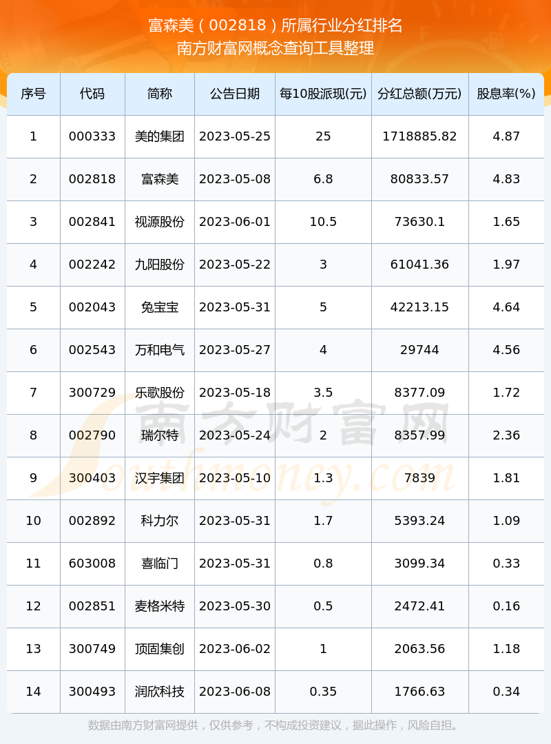 按照南方財富網(wǎng)趨勢選股系統(tǒng)統(tǒng)計,富森美所屬行業(yè)為商業(yè)百貨行業(yè),商業(yè)百貨行業(yè)分紅排名情況如下表: