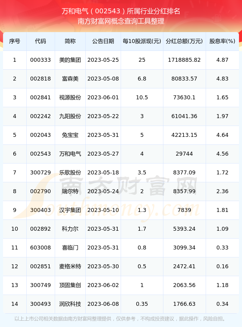二、萬和電氣002543行業(yè)分紅排名
