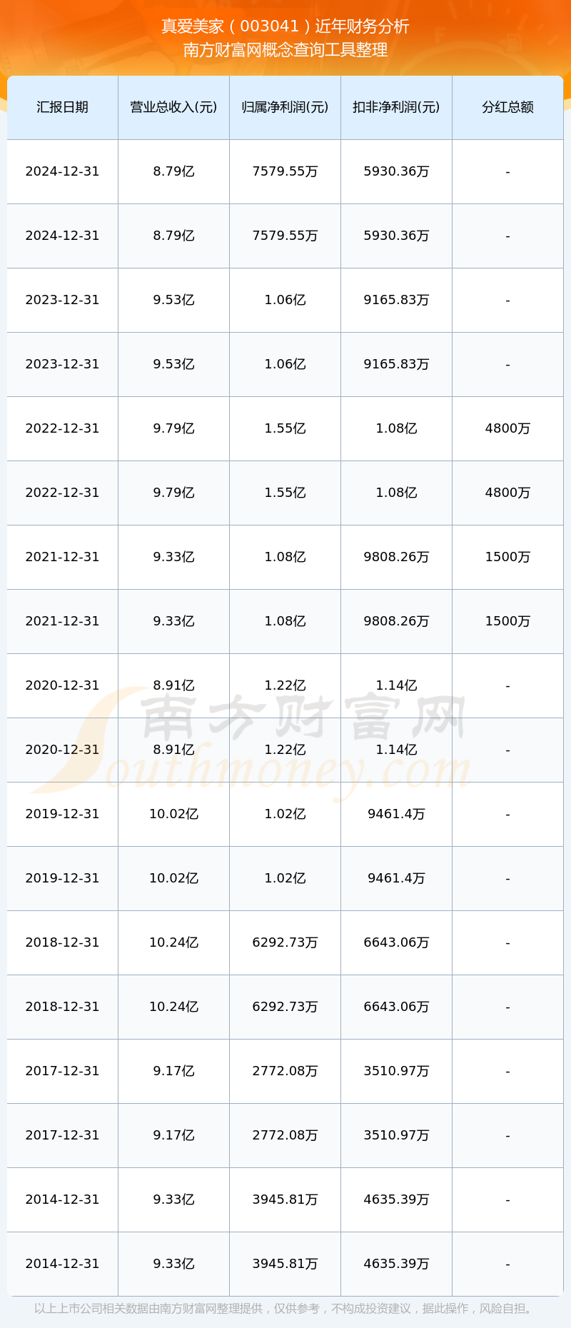 2024年報顯示,真愛美家實現(xiàn)營收8.79億,同比增長-7.77%;凈利潤7579.55萬,同比增長-28.46%;毛利率19.45%。
