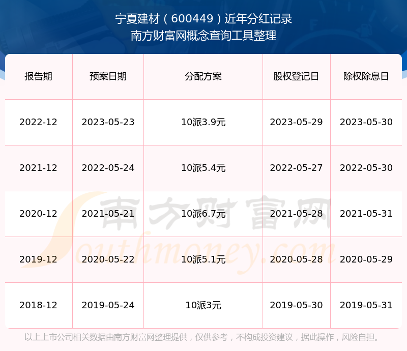 寧夏建材最新一次公布的分紅方案為10派3.9元。本次權(quán)益分派股權(quán)登記日為2023年5月29日,除權(quán)除息日為2023年5月30日,派息日為2023年5月30日。