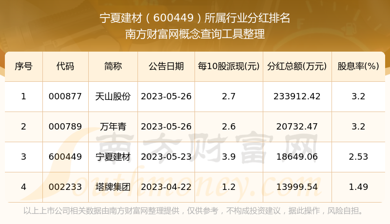 按照南方財(cái)富網(wǎng)趨勢(shì)選股系統(tǒng)統(tǒng)計(jì),寧夏建材所屬行業(yè)為水泥行業(yè),水泥行業(yè)分紅排名情況如下表: