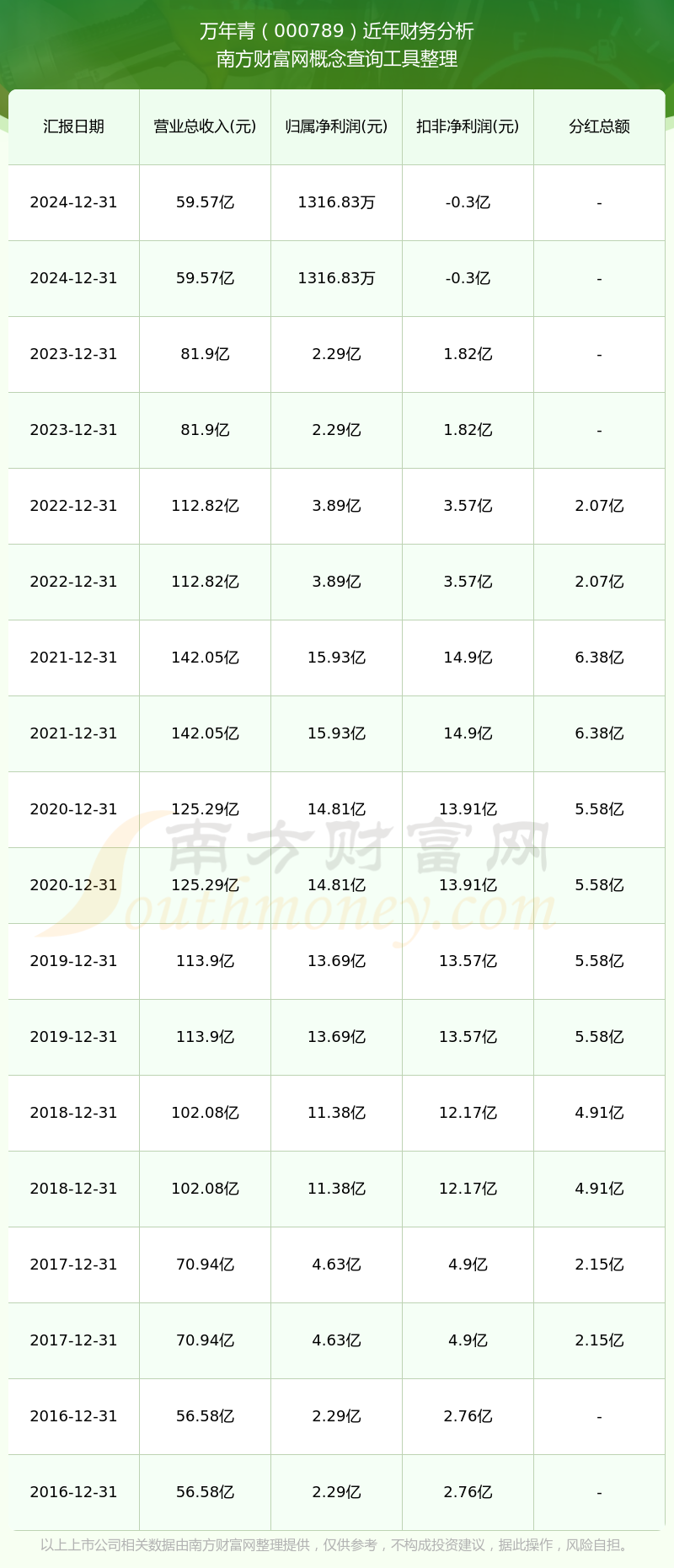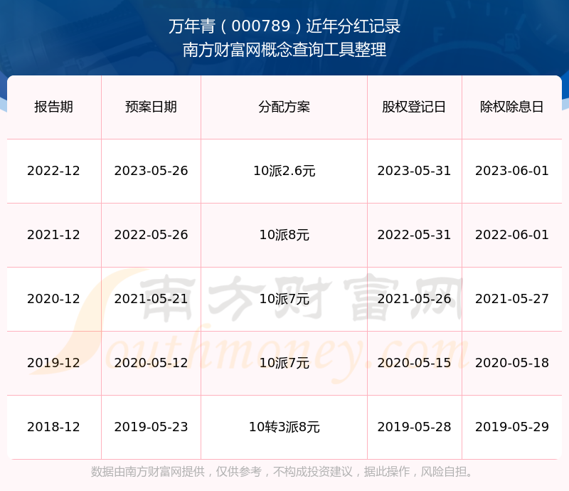 近年萬年青分紅派息情況如下表所示: