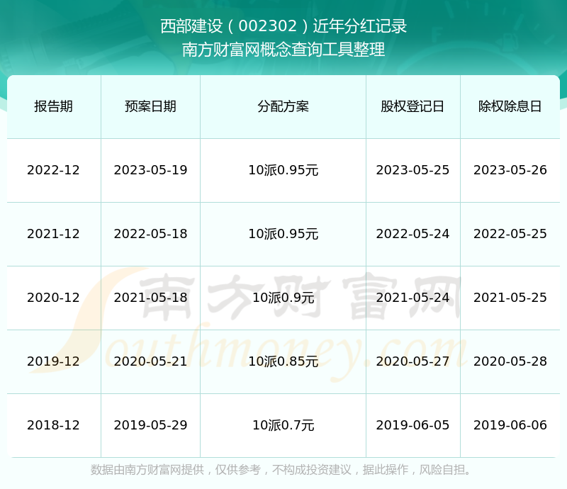 西部建設(shè)最新一次公布的分紅方案為10派0.95元。本次權(quán)益分派股權(quán)登記日為2023年5月25日,除權(quán)除息日為2023年5月26日,派息日為2023年5月26日。