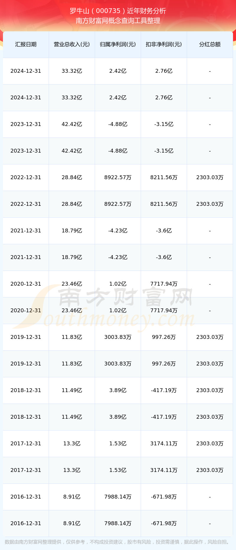 2024年報(bào)顯示,羅牛山實(shí)現(xiàn)營收33.32億,同比增長-21.44%;凈利潤2.42億,同比增長149.58%;毛利率23.81%。