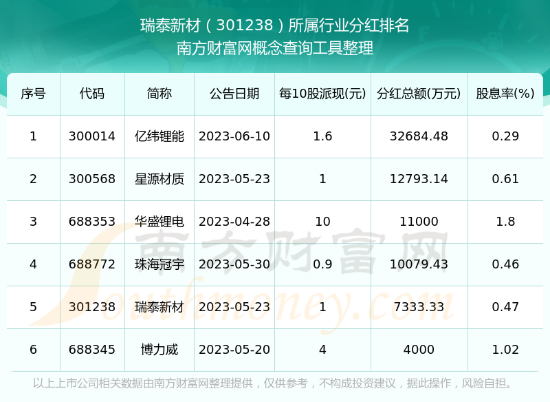 二、瑞泰新材301238行業(yè)分紅排名