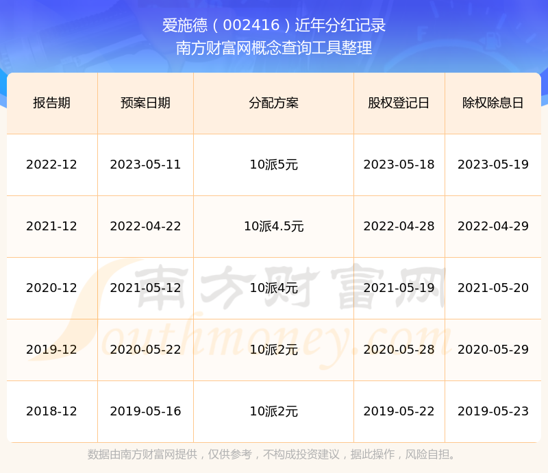 愛(ài)施德最新一次公布的分紅方案為10派5元。本次權(quán)益分派股權(quán)登記日為2023年5月18日,除權(quán)除息日為2023年5月19日,派息日為2023年5月19日。
