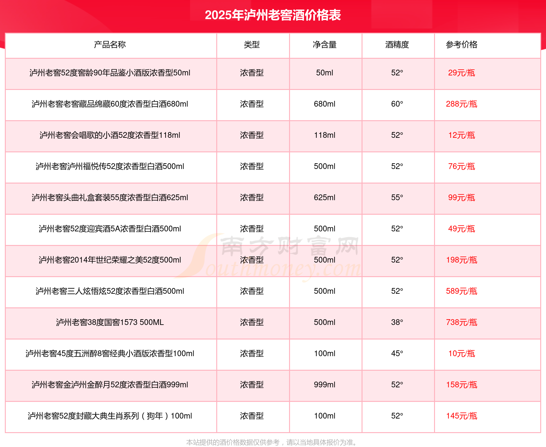 瀘州老窖酒價格表2025一覽(多少錢一瓶)