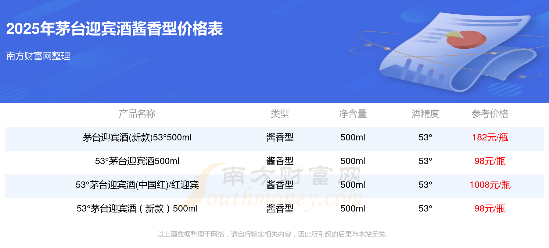 茅臺迎賓酒醬香型酒最新價格2025:53°茅臺迎賓酒(中國紅)/紅迎賓參考價1008元/瓶、茅臺迎賓酒(新款)53°500ml參考價182元/瓶、53°茅臺迎賓酒(新款)500ml參考價98元/瓶、53°茅臺迎賓酒500ml參考價98元/瓶。