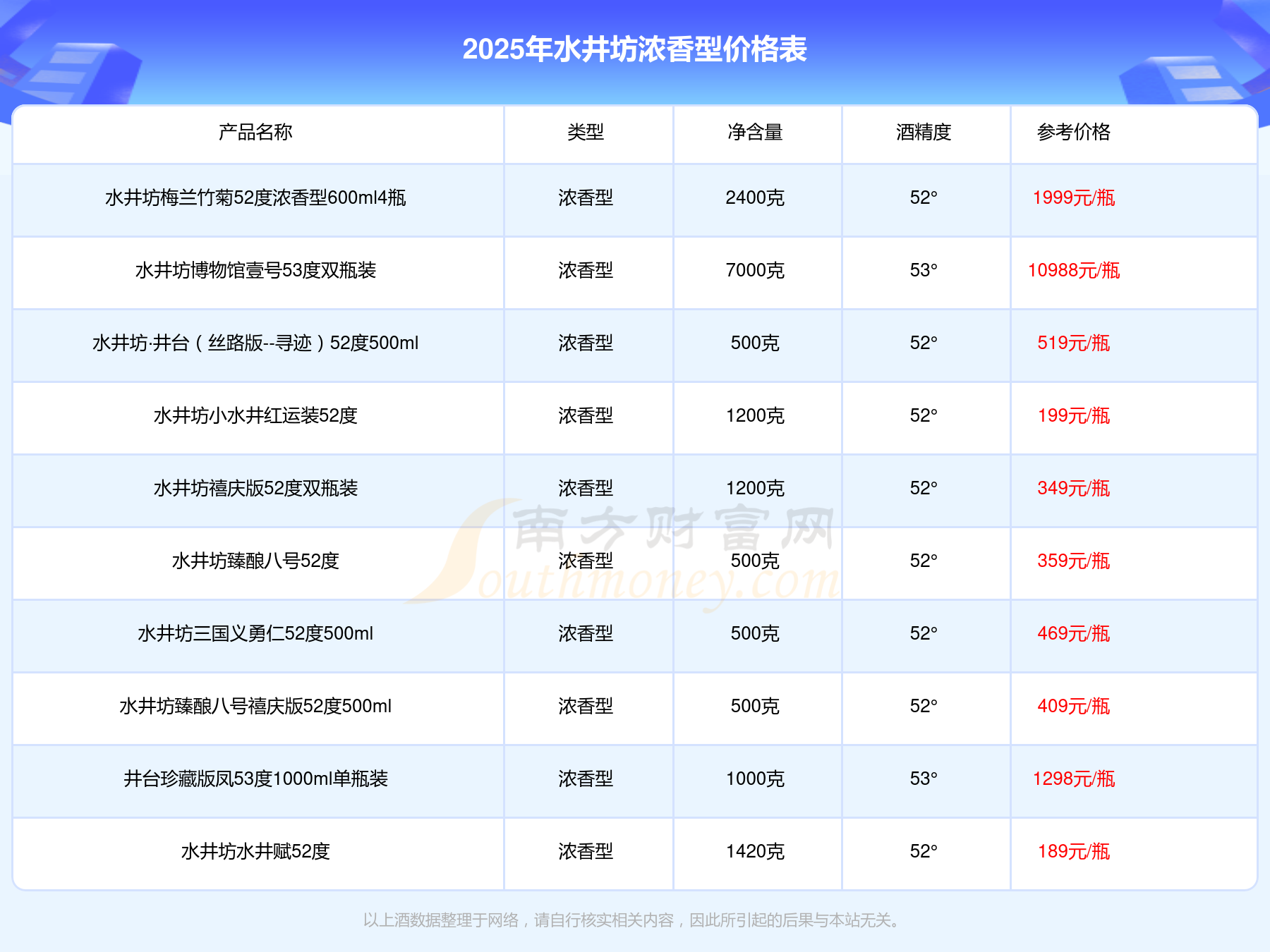 2025年水井坊濃香型價格最高的酒是水井坊大壇收藏級原漿天球瓶66度,參考價13999元/瓶,最低的是水井坊小水井52度500ml,參考價158元/瓶,價格高低差為13841元/瓶。