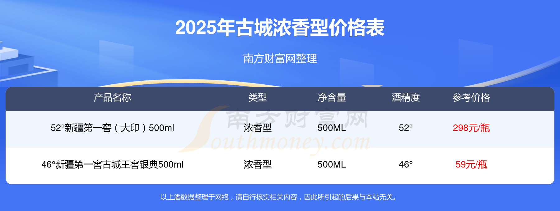 古城濃香型酒價格最高的是52°新疆第一窖(大。500ml,參考價298元/瓶,最低的是46°新疆第一窖古城王窖銀典500ml,參考價59元/瓶,價格高低差為239元/瓶。