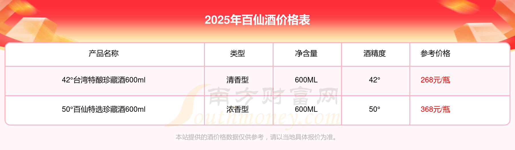 2025年,50°百仙特選珍藏酒600ml、42°臺灣特釀?wù)洳鼐?00ml等百仙酒價格如下: