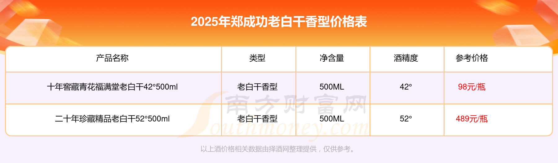 2025年鄭成功老白干香型酒二十年珍藏精品老白干52°500ml、十年窖藏青花福滿堂老白干42°500ml等最新價格如下:二十年珍藏精品老白干52°500ml參考價489元/瓶、十年窖藏青花福滿堂老白干42°500ml參考價98元/瓶。