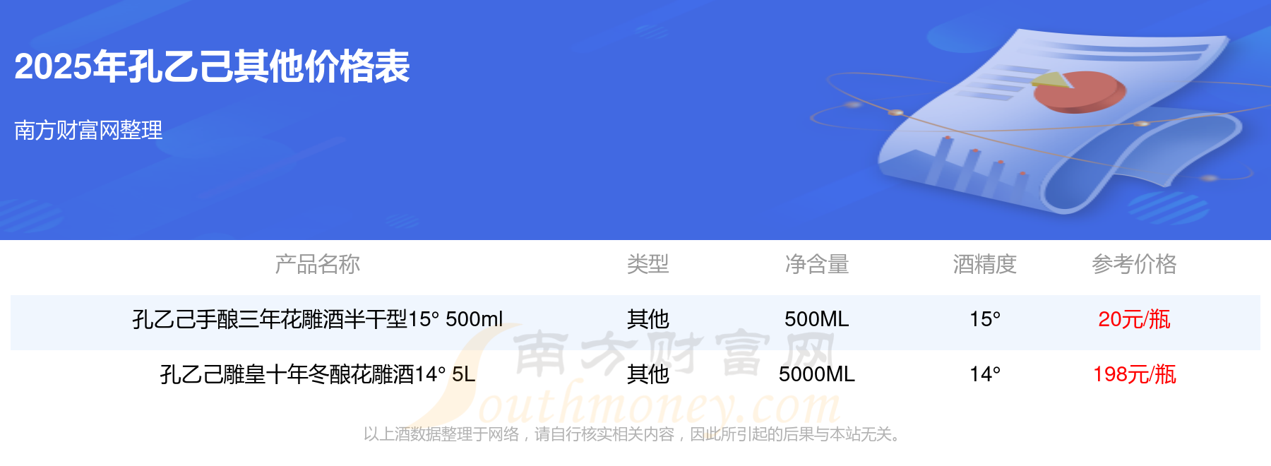 孔乙己其他酒最新價格2025:孔乙己雕皇十年冬釀花雕酒14° 5L參考價198元/瓶、孔乙己手釀三年花雕酒半干型15° 500ml參考價20元/瓶。
