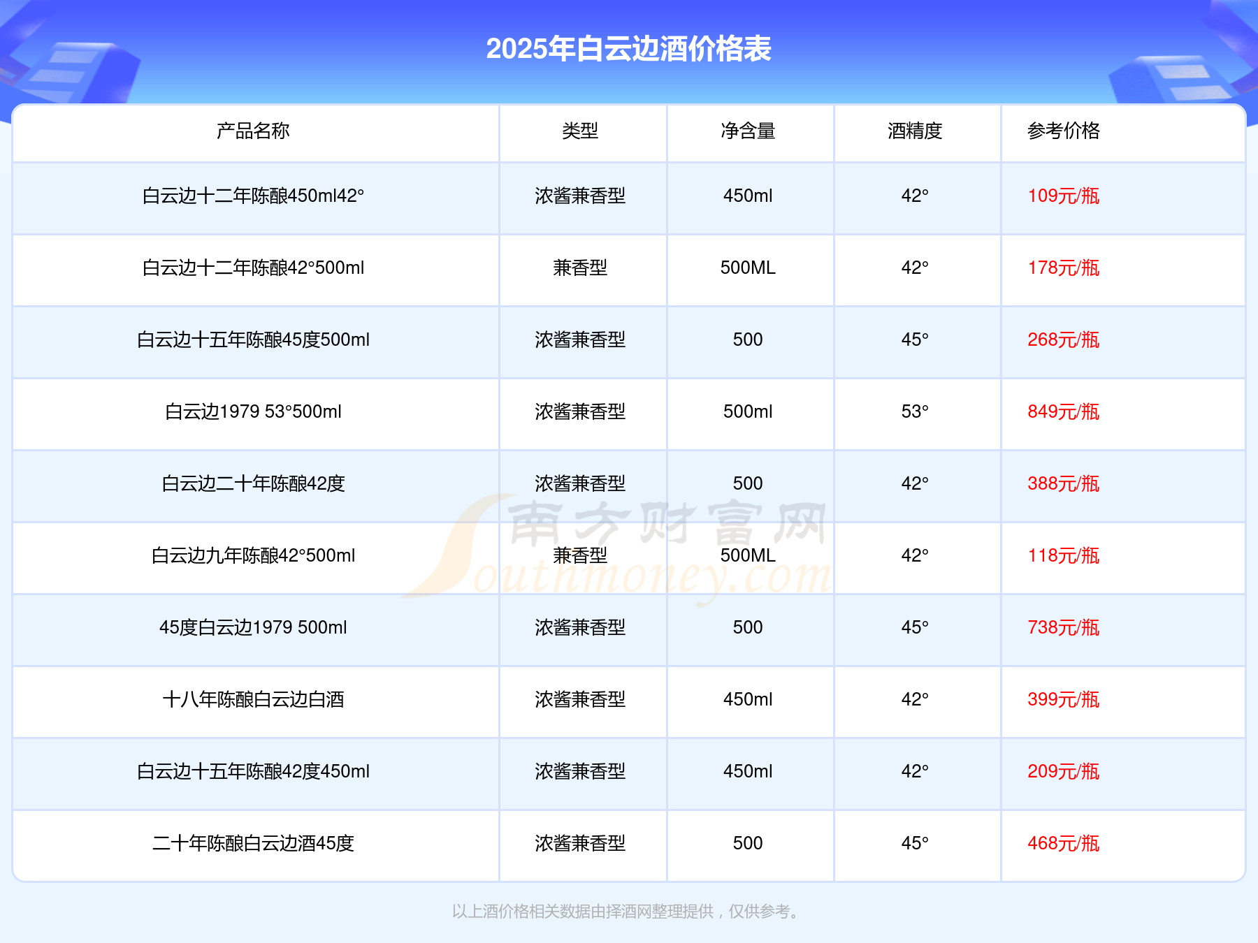 2025年白云邊酒白云邊1979 53°500ml、45度白云邊1979 500ml、二十年陳釀白云邊酒45度、十八年陳釀白云邊白酒等最新價(jià)格如下: