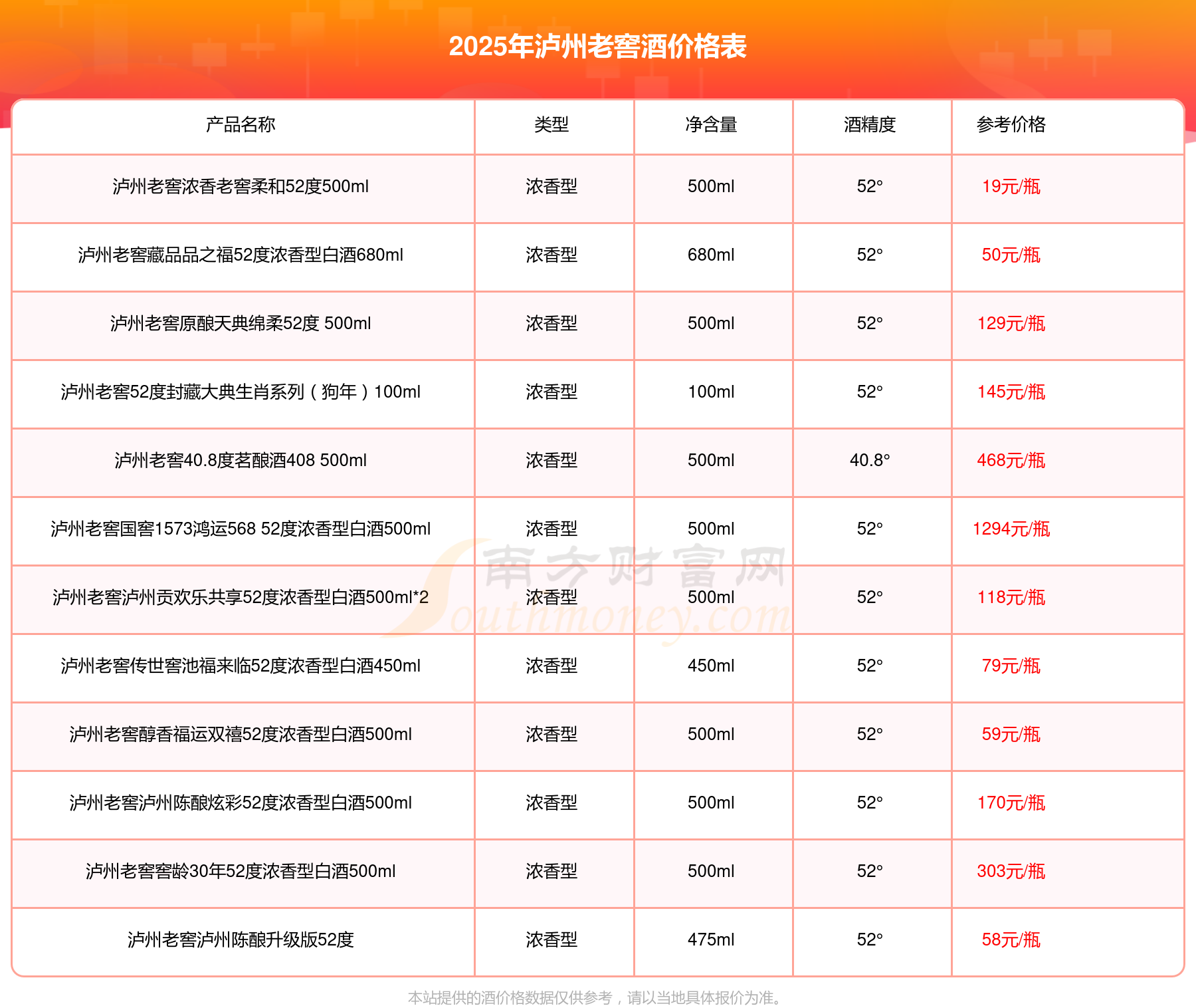 2025年瀘州老窖價格最高的酒是瀘州老窖國窖1573春釀鼠兆豐年E 55度,參考價17999元/瓶,最低的是瀘州老窖45度五洲醉8窖經(jīng)典小酒版濃香型100ml,參考價10元/瓶,價格高低差為17989元/瓶。