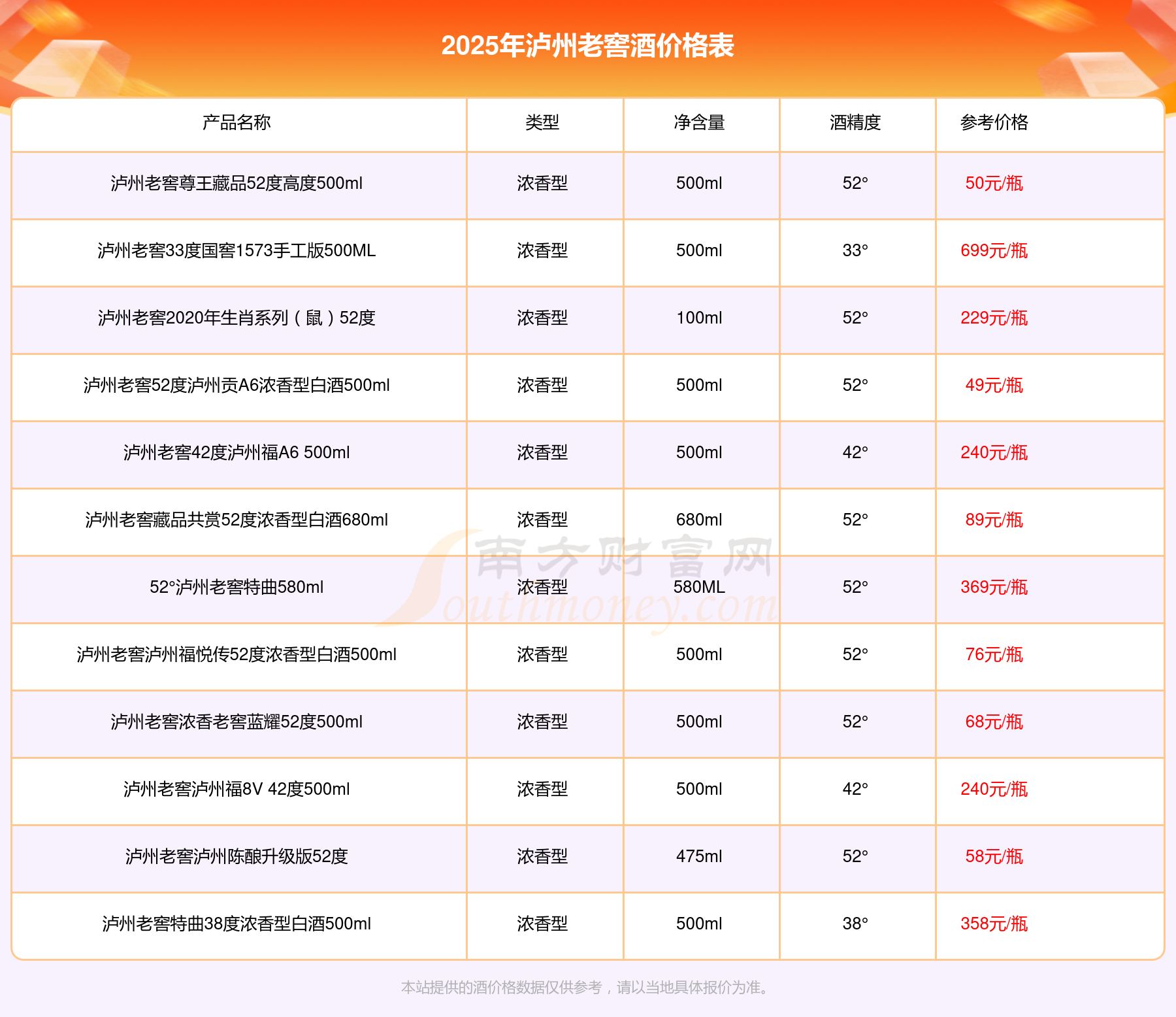瀘州老窖國窖1573春釀鼠兆豐年E 55度參考價17999元/瓶、瀘州老窖國窖1573生命中的那壇酒55度014參考價9999元/瓶、瀘州老窖國窖1573春釀鼠兆豐年A 55度參考價5088元/瓶、瀘州老窖國窖1573生命中的那壇酒55度013濃香型白酒1000ml參考價4988元/瓶、瀘州老窖國窖1573生命中的那壇酒55度009 1000ml參考價4288元/瓶、瀘州老窖國窖1573中國品味52度濃香型白酒500ml參考價2888元/瓶。