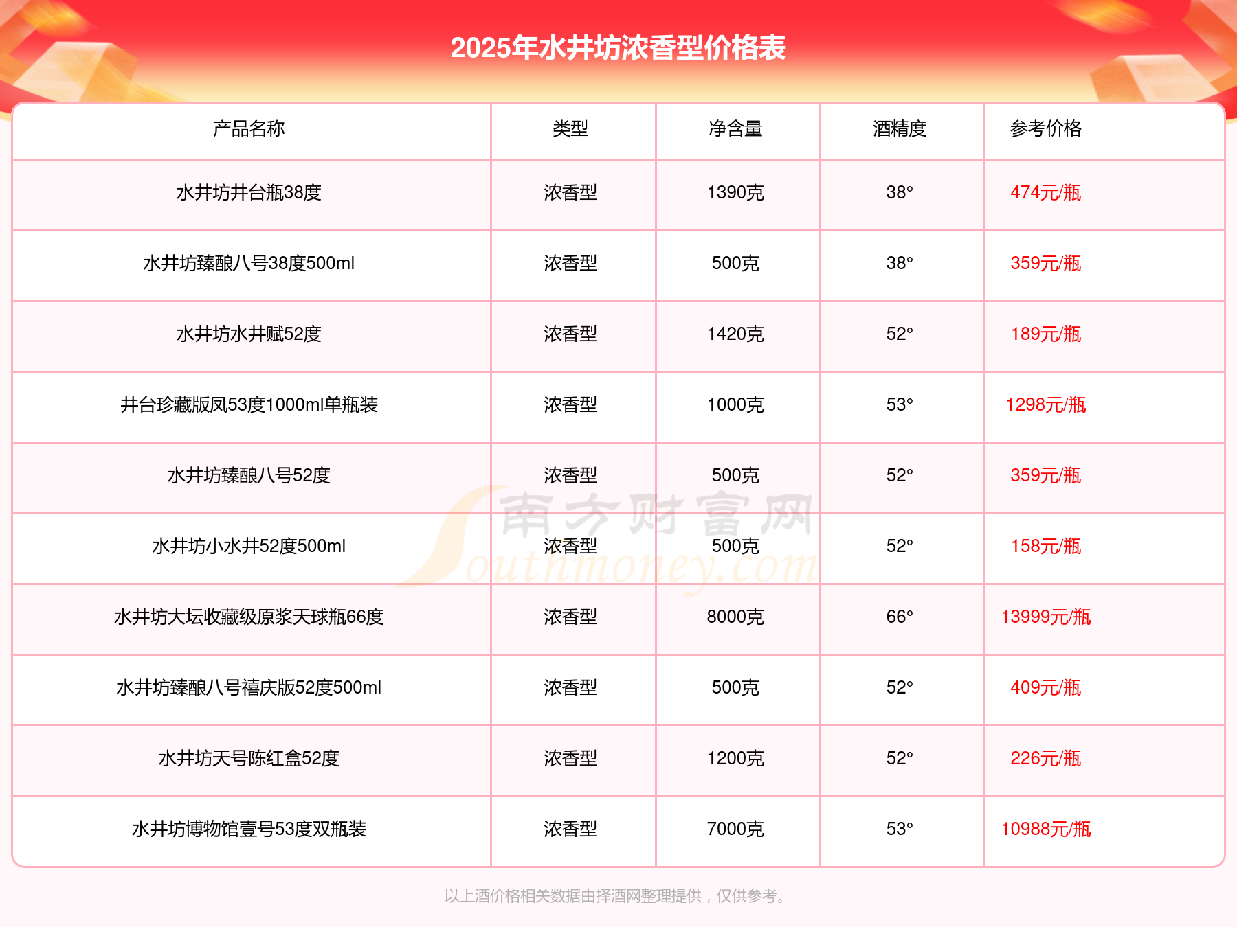 2025年水井坊濃香型酒水井坊大壇收藏級原漿天球瓶66度、水井坊博物館壹號53度雙瓶裝、53°水井坊公元十三600ml、水井坊梅蘭竹菊52度濃香型600ml4瓶、水井坊菁翠52度500ml、井臺珍藏版龍53度1000ml單瓶裝、井臺珍藏版鳳53度1000ml單瓶裝等最新價格如下:水井坊大壇收藏級原漿天球瓶66度參考價13999元/瓶、水井坊博物館壹號53度雙瓶裝參考價10988元/瓶、53°水井坊公元十三600ml參考價2580元/瓶、水井坊梅蘭竹菊52度濃香型600ml4瓶參考價1999元/瓶、水井坊菁翠52度500ml參考價1650元/瓶、井臺珍藏版龍53度1000ml單瓶裝參考價1298元/瓶、井臺珍藏版鳳53度1000ml單瓶裝參考價1298元/瓶。