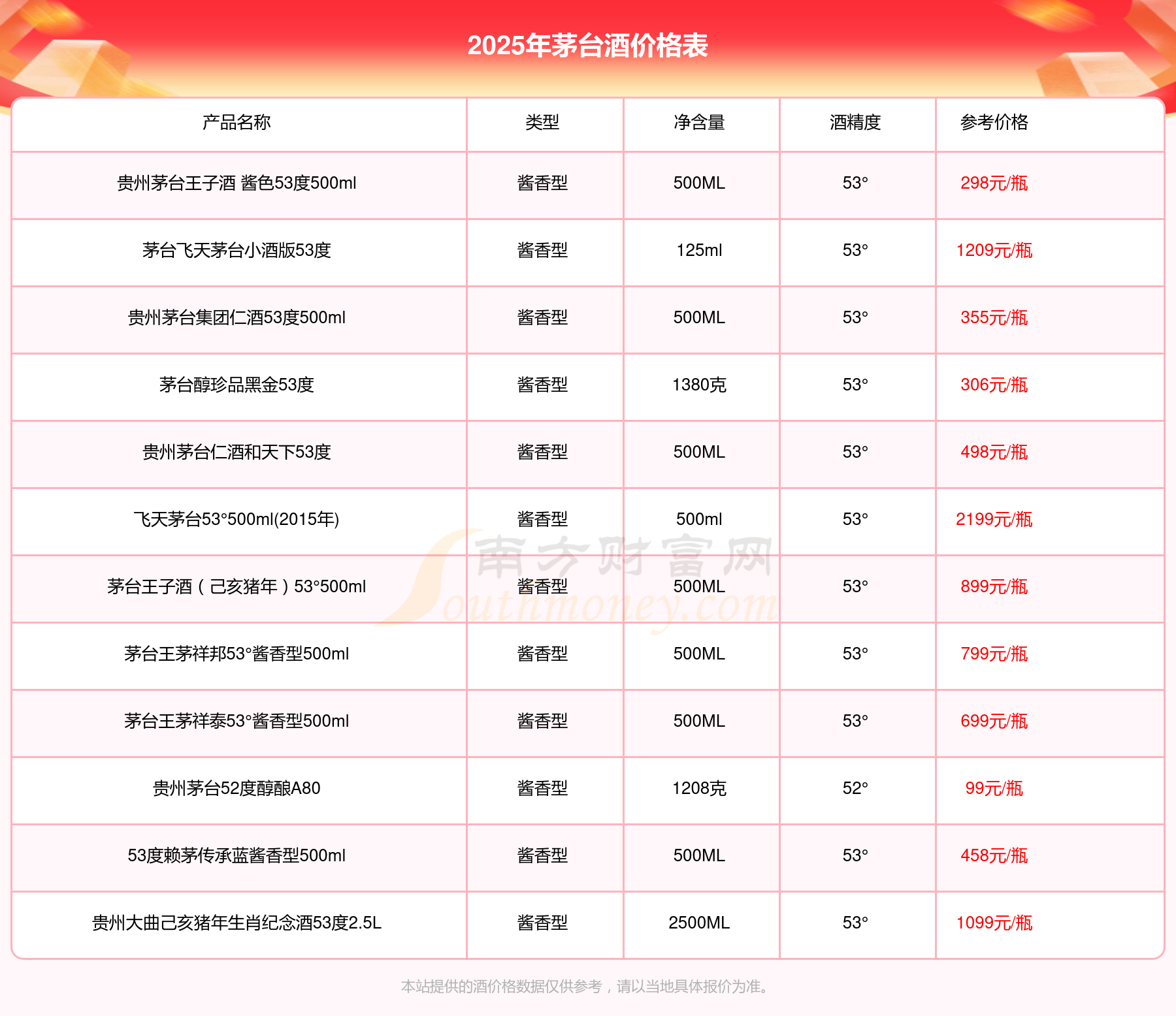 2025年,華茅鑒藏 醬香型白酒 3L 53°、53度五星茅臺(tái)生肖酒丁酉雞年、貴州茅臺(tái)己亥豬年生肖酒53°500ml、53度五星茅臺(tái)生肖酒戊戌狗年、飛天茅臺(tái)53°500ml(2015年)、茅臺(tái)王子酒己亥豬年生肖紀(jì)念酒53度2.5L、茅臺(tái)1935醬香型53度、茅臺(tái)財(cái)富貴賓典藏酒53度等茅臺(tái)酒價(jià)格如下:華茅鑒藏 醬香型白酒 3L 53°參考價(jià)8388元/瓶、53度五星茅臺(tái)生肖酒丁酉雞年參考價(jià)2798元/瓶、貴州茅臺(tái)己亥豬年生肖酒53°500ml參考價(jià)2699元/瓶、53度五星茅臺(tái)生肖酒戊戌狗年參考價(jià)2698元/瓶、飛天茅臺(tái)53°500ml(2015年)參考價(jià)2199元/瓶、茅臺(tái)王子酒己亥豬年生肖紀(jì)念酒53度2.5L參考價(jià)2099元/瓶、茅臺(tái)1935醬香型53度參考價(jià)1799元/瓶、茅臺(tái)財(cái)富貴賓典藏酒53度參考價(jià)1599元/瓶。
