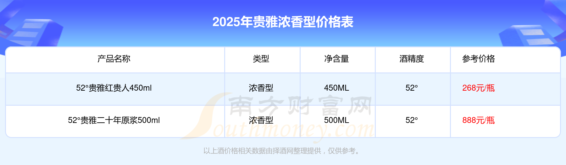 2025年,52°貴雅二十年原漿500ml、52°貴雅紅貴人450ml等貴雅濃香型酒價(jià)格如下: