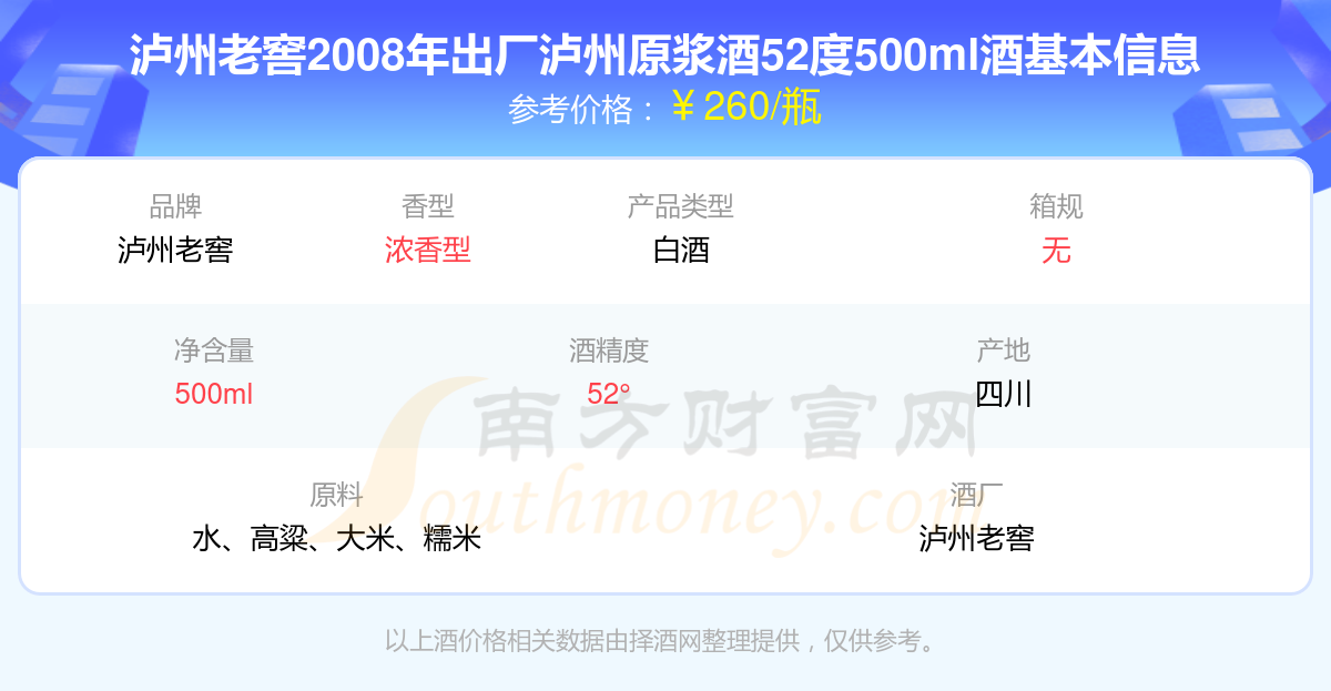 瀘州老窖2008年出廠瀘州原漿酒52度500ml基本信息